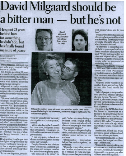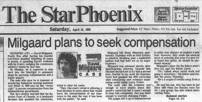 The Milgaard case remained a topic of public and media outrage. This pressure forced the Saskatchewan government to appoint Alan Gold, retired Quebec Superior Court Justice, to negotiate a compensation package for Milgaard. His recommendation of a $10-million settlement was accepted by the government in May 1999.
